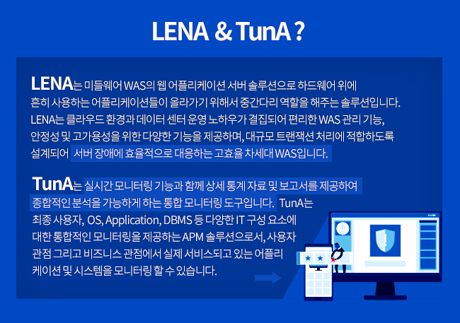 | 신민채 | 저는 WEB WAS 쪽을 하고 있는데요 LENA(레나)와 TunA(튜나) 등 솔루션 관련 업무를 담당하고 있습니다. |