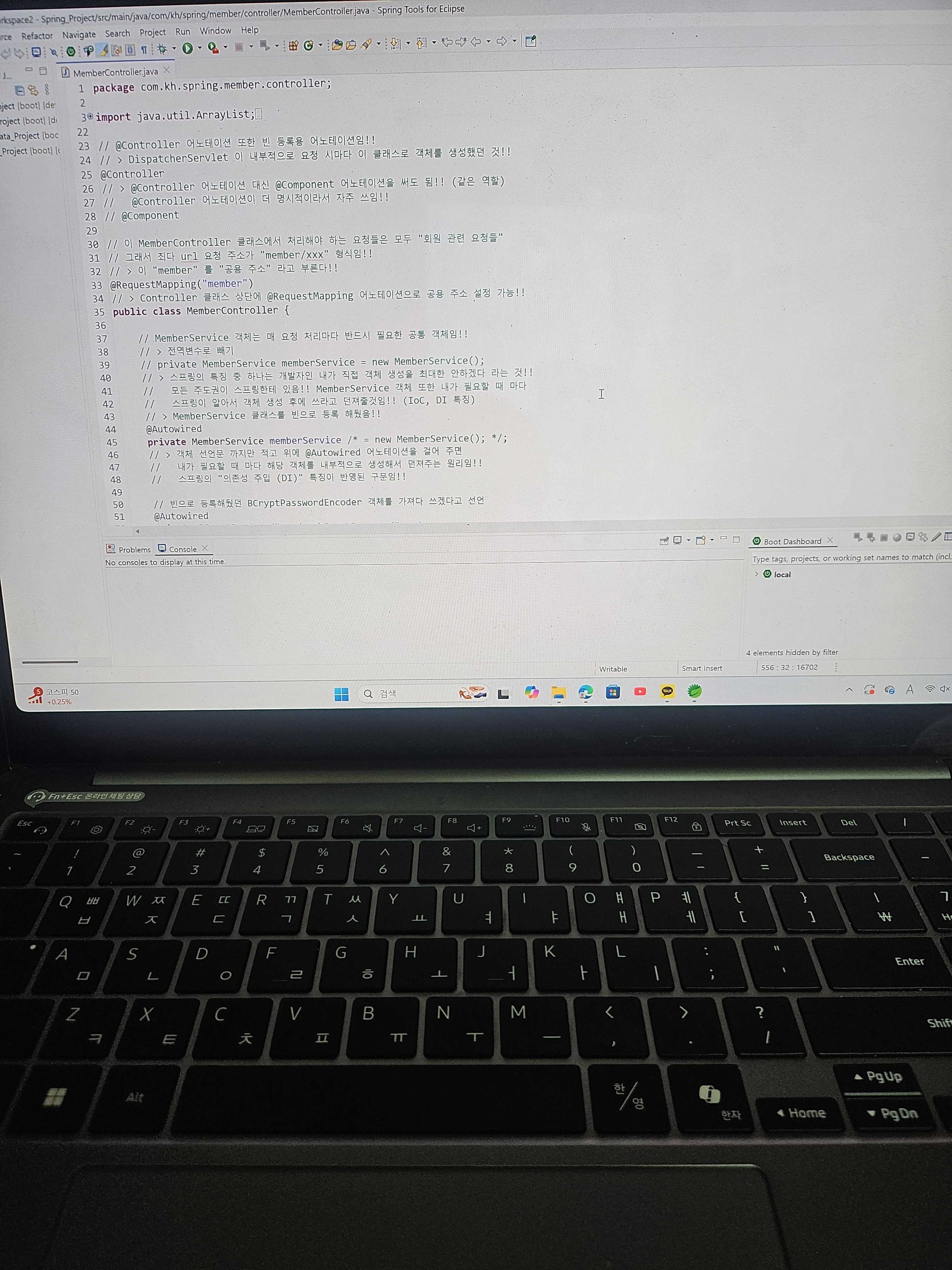 코드에 대한 이해가 바로바로 되지 않아서 지체되고 밀리는 느낌을 받았습니다. 그래서 먼저 외우고 이해하는 방향으로 공부했습니다. 물론 모든 것을 외우기는 힘들기 때문에, 선생님께서 중요하다고 한 것과, 제가 실제 프로젝트를 할 때와 따로 공부하고 자료를 찾아봤을 때 중요하다고 생각한 것들, 자주나오는 것들을 위주로 암기했습니다.