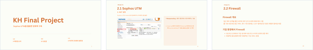 :외부 네트워크, DMZ, 내부 네트워크(Internal) 영역으로 구성된 네트워크 설계를 기반으로, 방화벽 SOPHOS UTM9을 통해 외부 접근을 통제하고 영역 간 접근 제어 강화한다.