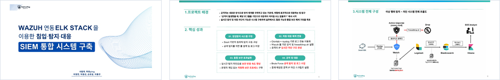 Wazuh, Elasticsearch, Kibana, Logstash를 연동하여 보안 로그 수집, 저장, 시각화, 분석 환경을 통합 구성한다.